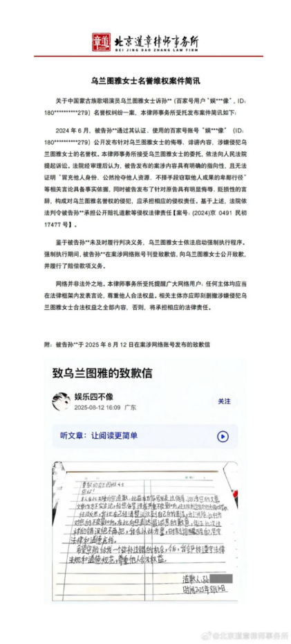烏蘭圖雅勝訴 侵權(quán)者致歉賠償