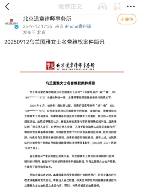 近日,歌唱演員烏蘭圖雅訴孫某某的名譽(yù)權(quán)糾紛一案塵埃落定。經(jīng)法院審理判決,侵權(quán)者孫某某已公開(kāi)致歉并履行賠償款項(xiàng),這起典型案例再次印證 “網(wǎng)絡(luò)不是法外之地”,為了博取流量或出于不可告人目的在網(wǎng)上侮辱、誹謗他人,終將受到法律制裁。