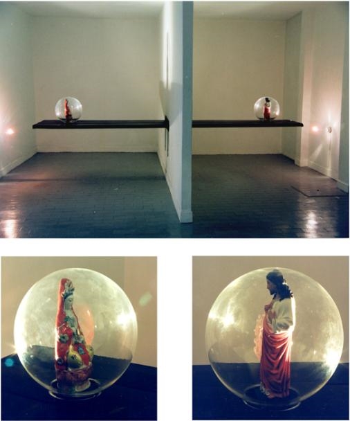 張琪凱 《平衡儀》 裝置 2000 木頭,樹脂,觀音塑像,耶穌塑像