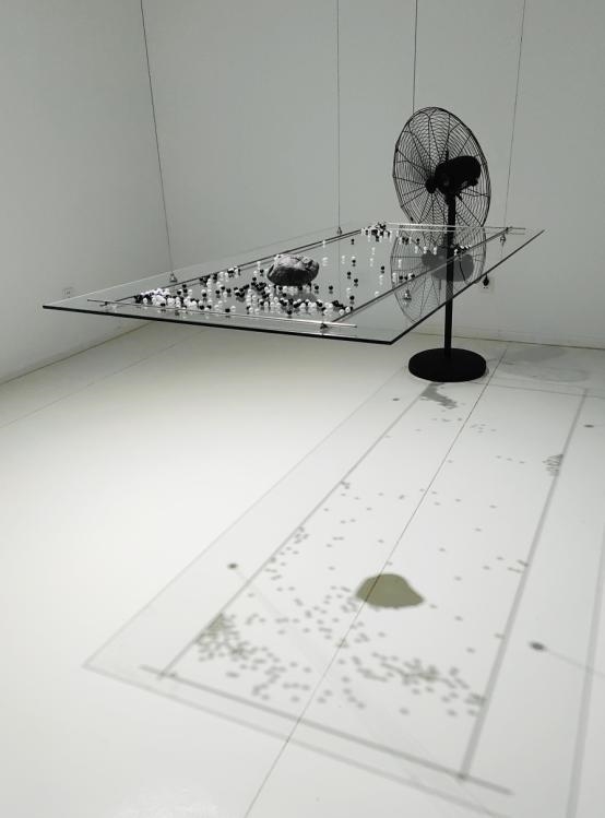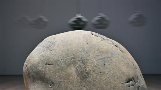 近年來,張琪凱試圖跳出短期時(shí)代議題,聚焦“物與物的關(guān)聯(lián)”“動(dòng)與靜的辯證”“永恒關(guān)系”等本質(zhì)問題,作品可在不同社會(huì)語境下被多元解讀,如《恒NO.2》青磚與火山巖的組合,既關(guān)聯(lián)城市議題,也可映射關(guān)系平衡,兼具思辨性與開放性。他以“順其自然”的創(chuàng)作邏輯傳遞禪意,不刻意說教而重體驗(yàn),如《風(fēng)動(dòng)》中玻璃珠隨風(fēng)扇滾動(dòng)模擬海浪,讓觀眾在細(xì)微動(dòng)態(tài)中感知自然與規(guī)律,精準(zhǔn)擊中當(dāng)代人對(duì)精神寧靜的需求,玻璃平臺(tái)上,玻璃珠周而復(fù)始的滾動(dòng)傳遞“周而復(fù)始”的永恒感,靜止的石頭與流動(dòng)的珠子形成動(dòng)靜對(duì)比,暗合“靜止積聚勢能、動(dòng)態(tài)延續(xù)永恒”的深層認(rèn)知。作品無刻意說教,僅通過自然動(dòng)態(tài)讓觀眾在細(xì)微體驗(yàn)中感知禪意,同時(shí)以元素間的連帶關(guān)系,印證“一物變則萬物變”的世間本質(zhì)規(guī)律。