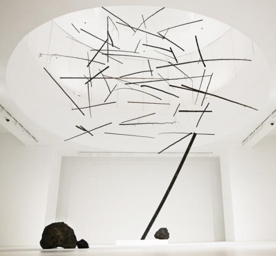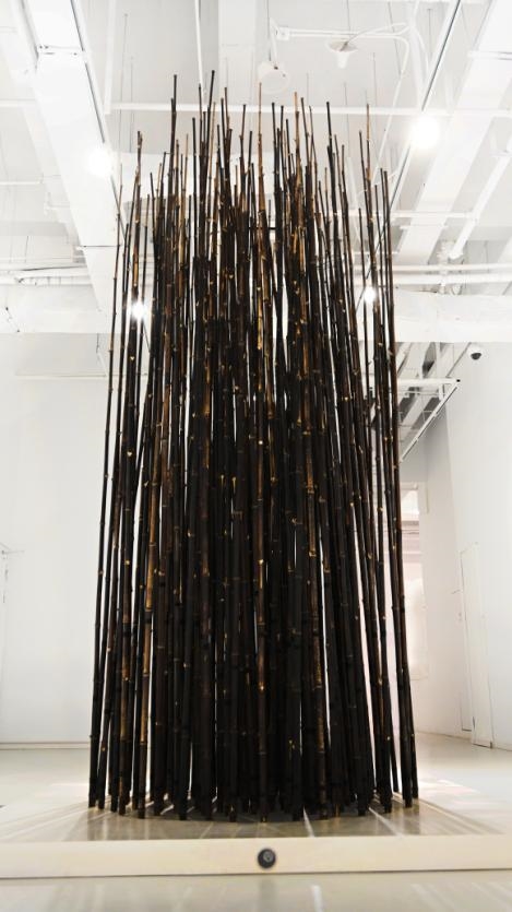 張琪凱擅長于自然材料(火山巖、竹子、石頭)與工業(yè)材料(鋼絲、電機(jī)、鐵管)的碰撞,如《盤桓》中火山巖(火之凝)與鋼絲(金之質(zhì))的組合,通過材料屬性轉(zhuǎn)化暗合五行思想,既具視覺張力又承載深層寓意。他能打破裝置與空間的割裂,以動(dòng)態(tài)元素激活靜態(tài)場景,如《怒而飛》借電機(jī)驅(qū)動(dòng)竹竿形成盤旋上升態(tài)勢,與展廳空間呼應(yīng)成“蓄勢待發(fā)”的能量場,讓觀眾從被動(dòng)觀看到主動(dòng)感知關(guān)系變化,火山巖的厚重冷峻與竹竿的輕盈柔韌形成質(zhì)感反差;搭配鋼絲、電機(jī)等工業(yè)材料,借電機(jī)驅(qū)動(dòng)實(shí)現(xiàn)動(dòng)態(tài)表達(dá),暗合五行“木與金”的相生關(guān)系,材料碰撞既具視覺張力,又成為思想載體。