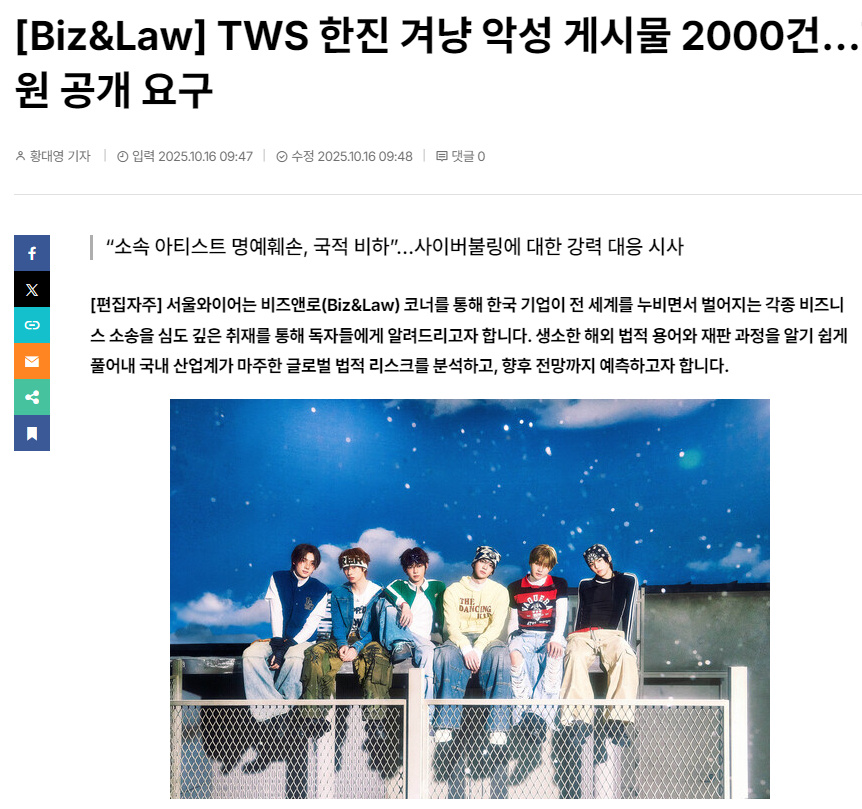 2000多篇針對TWS韓振的惡帖 HYBE要求X和谷歌公開相關(guān)惡評者身份