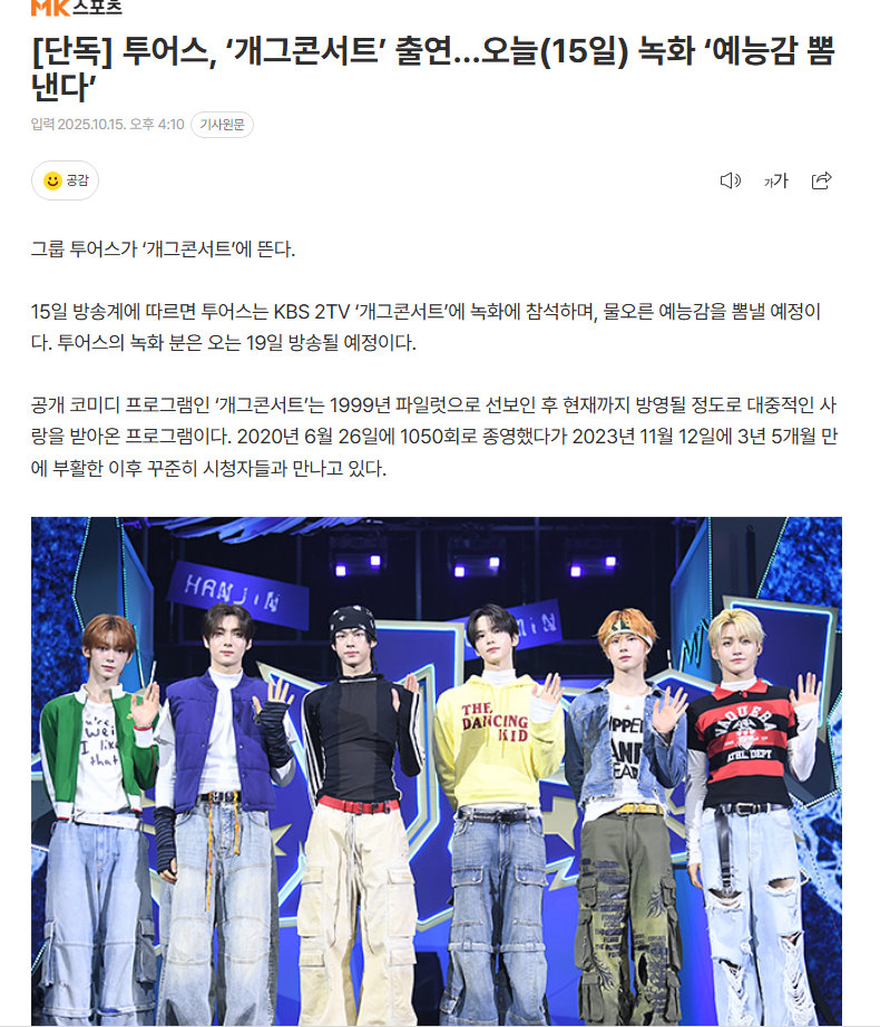 中國藝人網(wǎng)訊 www 11job com據(jù)韓媒15日消息,TWS已參與錄制KBS 2TV《Gag Concert》,將展現(xiàn)成熟的藝能感。TWS參與錄制的節(jié)目內(nèi)容 ...