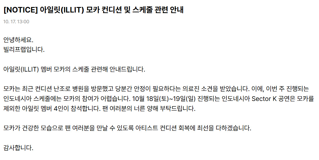 ?中國藝人網(wǎng)訊 www 11job com 10月17日,所屬社方面發(fā)文,宣布ILLIT成員MOKA因身體健康暫?;顒?dòng),將專心治療,希望粉絲們可以理解。 ...