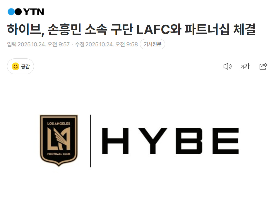 HYBE與孫興慜所屬球隊(duì)LAFC簽訂合作伙伴協(xié)議